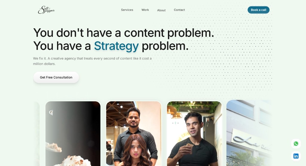 Marketing site for a creative agency focused on content strategy and high-impact storytelling. Shipped end to end in 4 days (31 Mar–4 Apr 2026): mint-toned hero with dot-grid detail, case-study style cards, and polished motion throughout the experience.